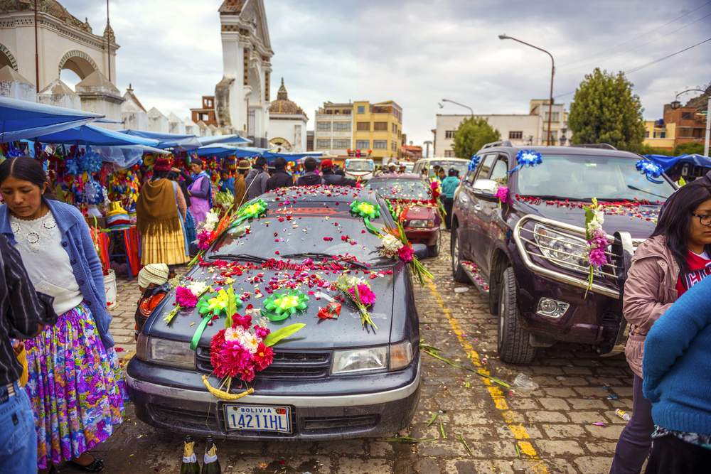 Priests perform vehicle blessing ceremonies to ensure safety and good fortune. The ritual involves prayer, holy water, perfumed smoke, symbolic drawings, and flower garlands. In Thailand, Buddhist monks regularly bless cars, motorcycles, and aircraft. The Philippines observes vehicle blessings during Palm and Easter Sundays. Bolivia's "La Bendición de Movilidades" occurs weekly at Copacabana near Lake Titicaca, where owners decorate cars with flowers and celebrate with champagne and fireworks after blessing.