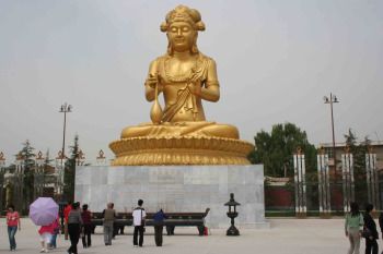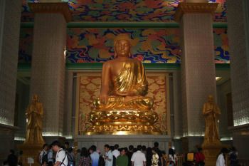 Leading up to the stupa is a long path that stretches for more than half a mile. Golden Bodhisattvas flank the walkway on both sides, inspiring worshipers to stop and pray with their incense sticks. Along the way are exhibits detailing Buddhism history and culture. “Current happiness and sufferings are not always caused by karmas in this life,” one sign read in English.