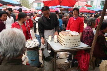 While there, I shuffled my way through a vast street market flooded with local people. A few merchants sold giant Chinese cakes, cleaving off a slice to any buyer. Here in the market the food is cheap, but the seating is crowded, where people squat on small stools and eat on foldable tables.