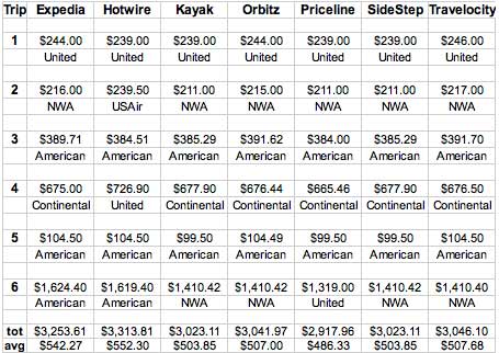 Expedia ($542.27), Orbitz ($507.00) and Travelocity ($507.68) – These sites clearly charge an extra $5.00 or so per ticket on many flights, though their searching ability did perform well. Expedia failed to find the cheaper trip to Singapore, but on the other five sample trips, they all performed almost identically.