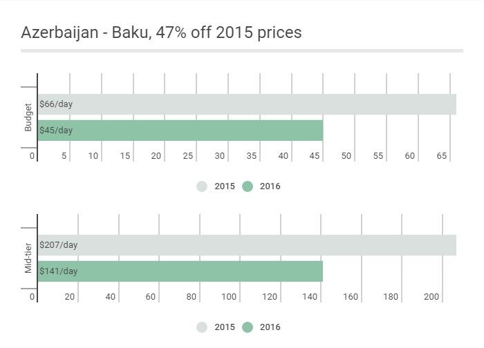 What’s happening in the wake of the plunge of crude oil prices this summer is worth noting for budget minded travelers. Azerbaijan, along with several other countries in the region, Kazakhstan and Russia included, moved to free float currencies within the past couple of months. As a result their currencies plunged, devaluing by as much as 50% overnight.