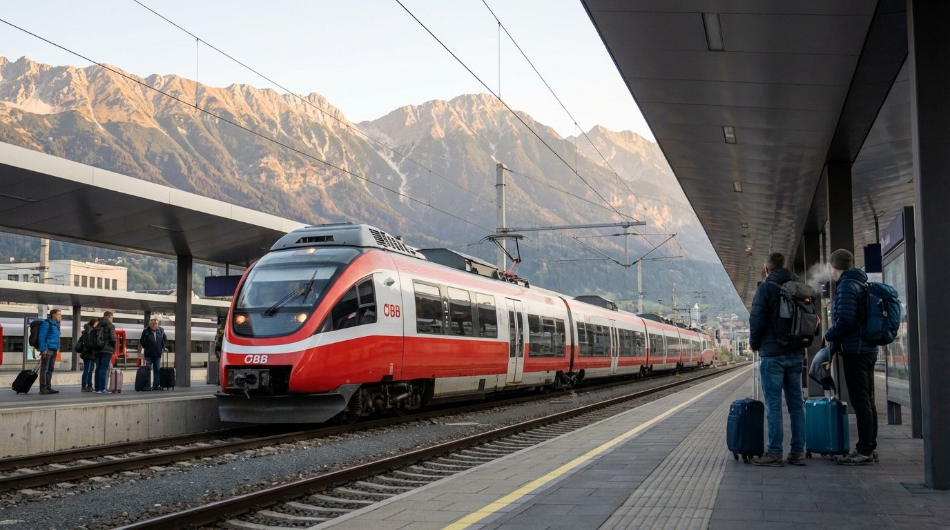 Vienna to Innsbruck4.25 hours, Railjet, 4-5 daily, no reservation required. €30-55 (~$33-60). The longest regular Railjet route, crossing toward the Tyrol Alps. The landscape transforms from farmland to dramatic mountains.