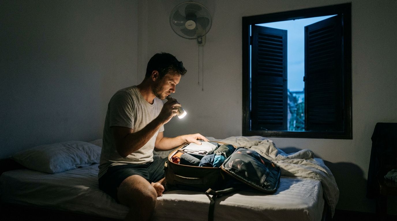 No light in hostel rooms while unpacking.